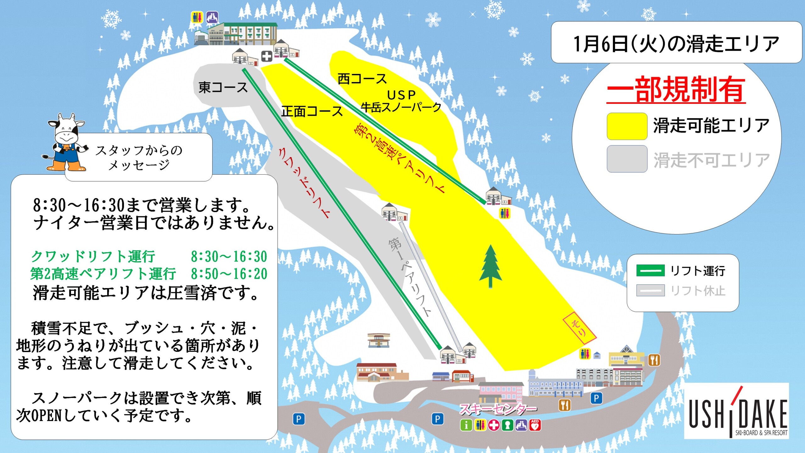 本日の1月6日(火)も正面コース+西コースのみ滑走可能で8:30~16:30まで営業します。