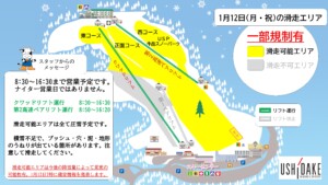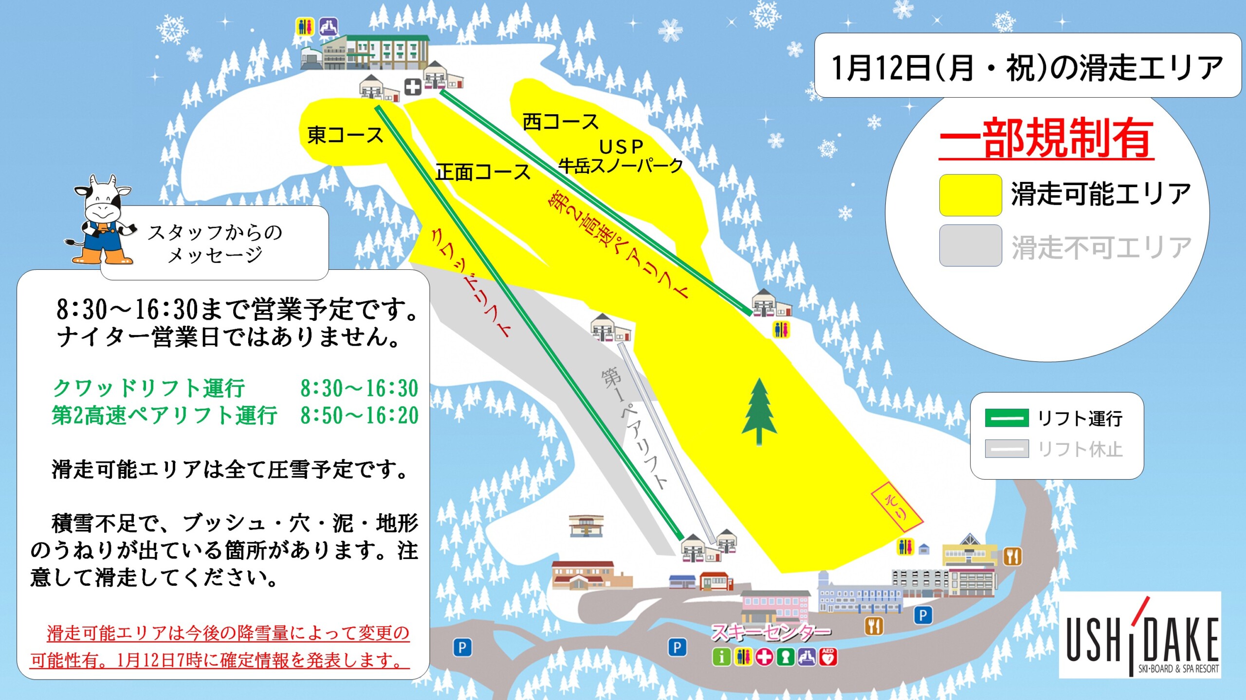 明日の1月12日(月・祝)は東コース下部以外は滑走可能として、8:30~16:30まで営業する予定です。