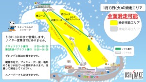明日の1月13日(火)は全面滑走可能として、8:30~16:30まで営業する予定です。