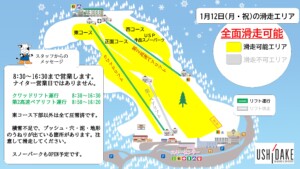 本日の1月12日(月・祝)は全面滑走可能として、8:30~16:30まで営業する予定です。