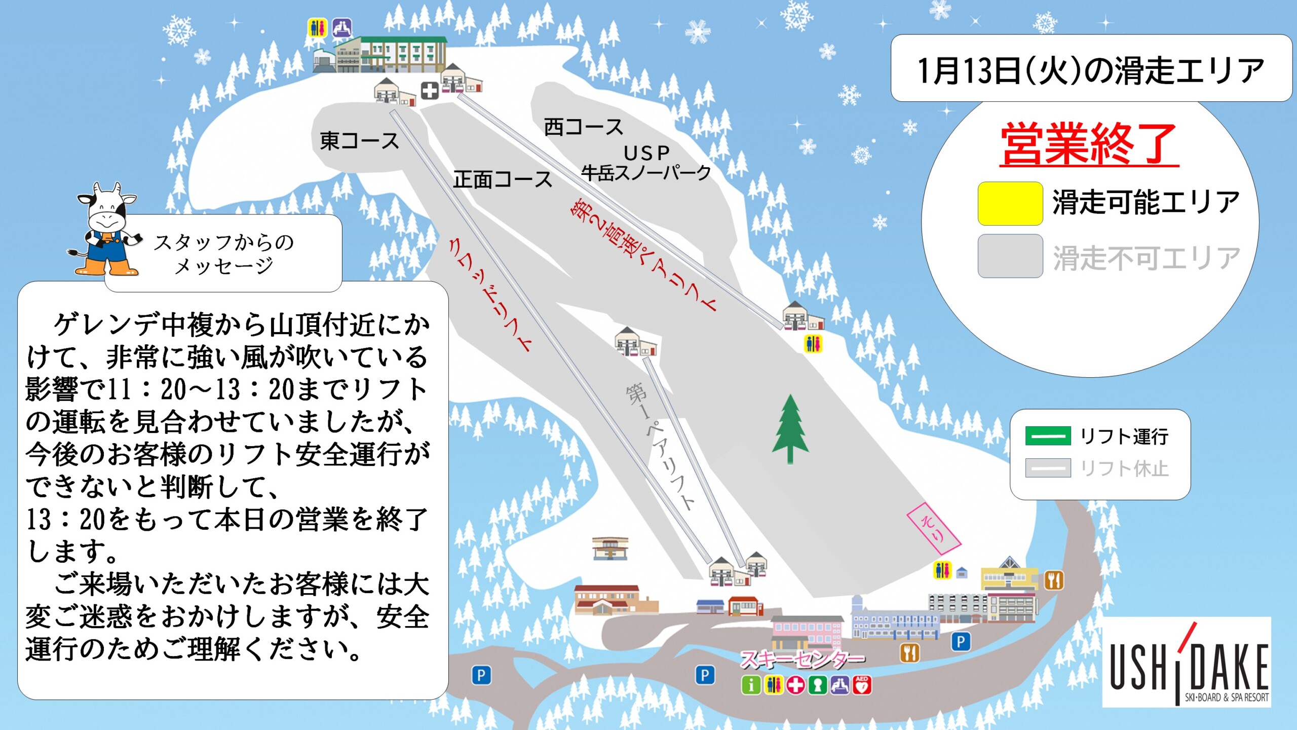 今後のお客様のリフト安全運行ができないと判断して、13:20をもって本日の営業を終了します。