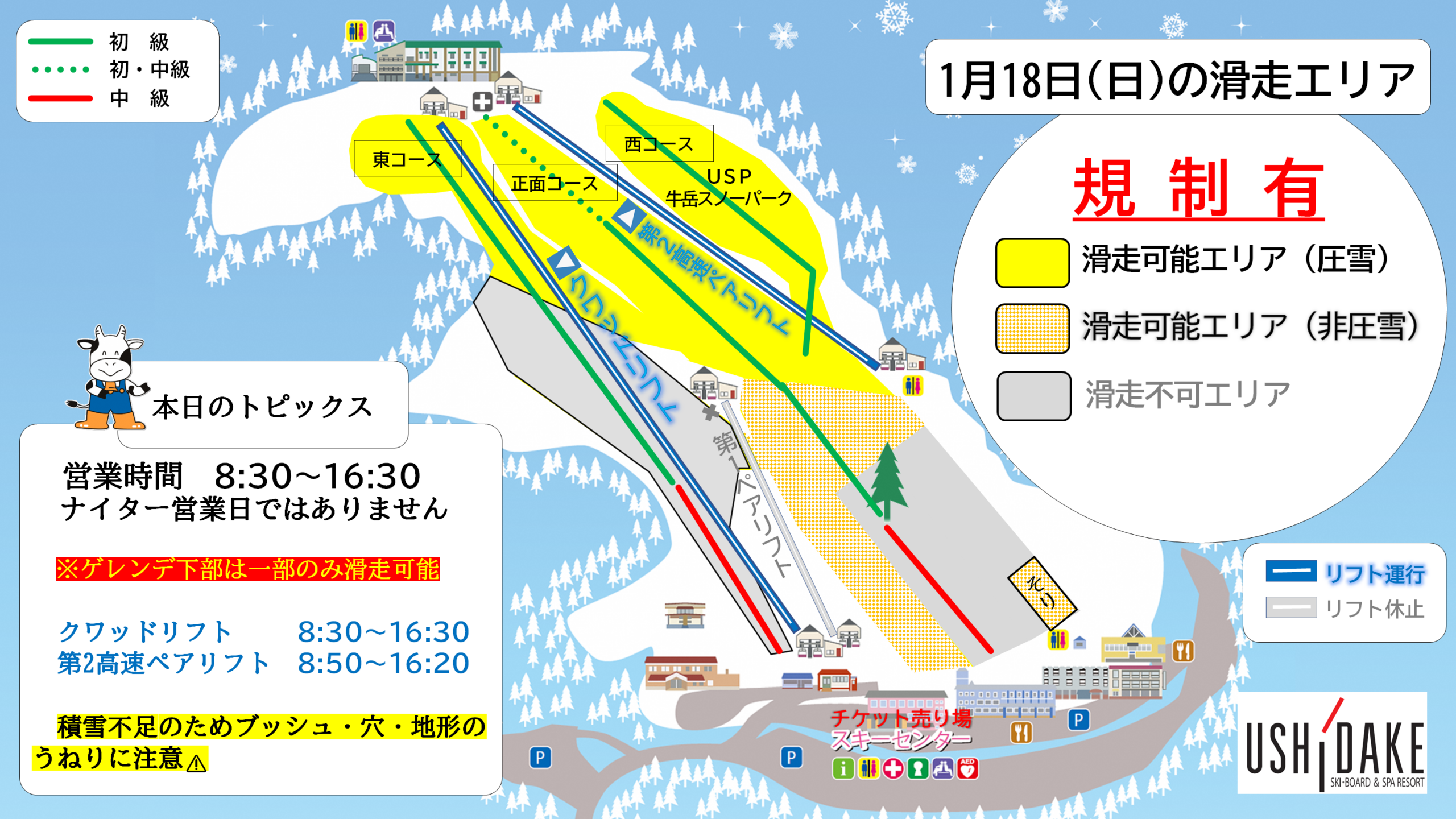 積雪不足のためゲレンデ下部は一部のみ滑走可能です。