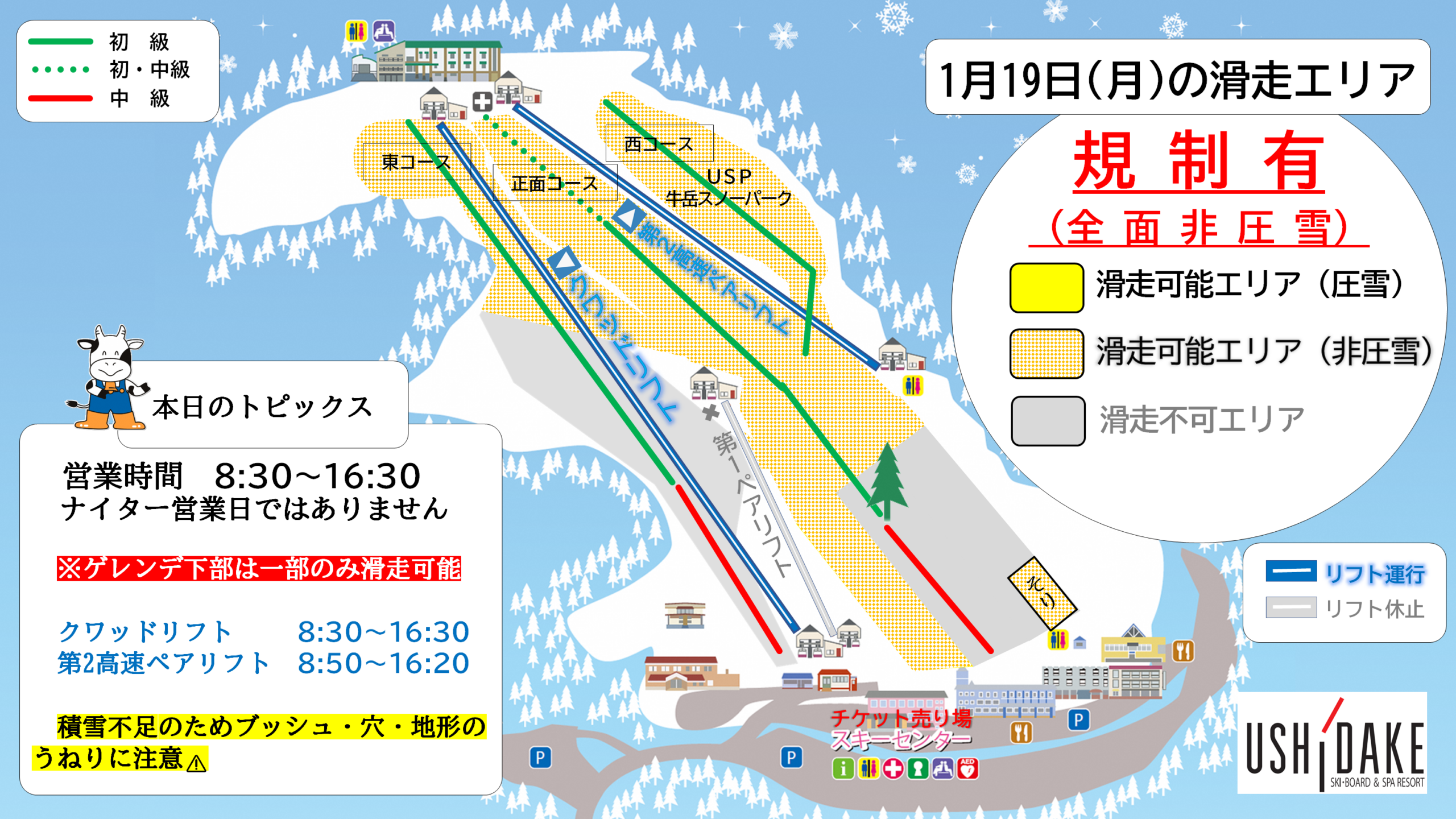 明日の1月19日(月)はコース規制有で、8:30~16:30まで営業します。