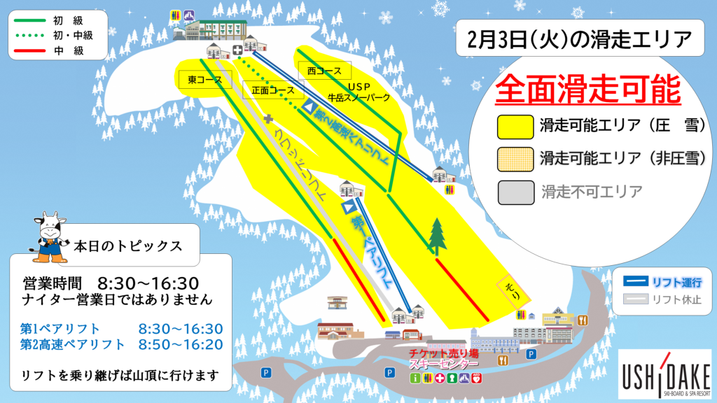 本日の2月3日(火)は全面滑走可能で、8:30~16:30まで営業します。