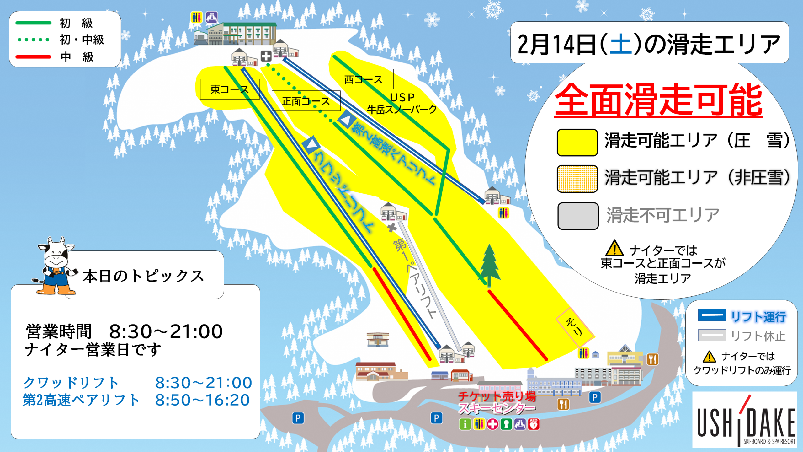 明日の2月14日(土)は全面滑走可能+ナイター営業で、8:30~21:00まで営業します。