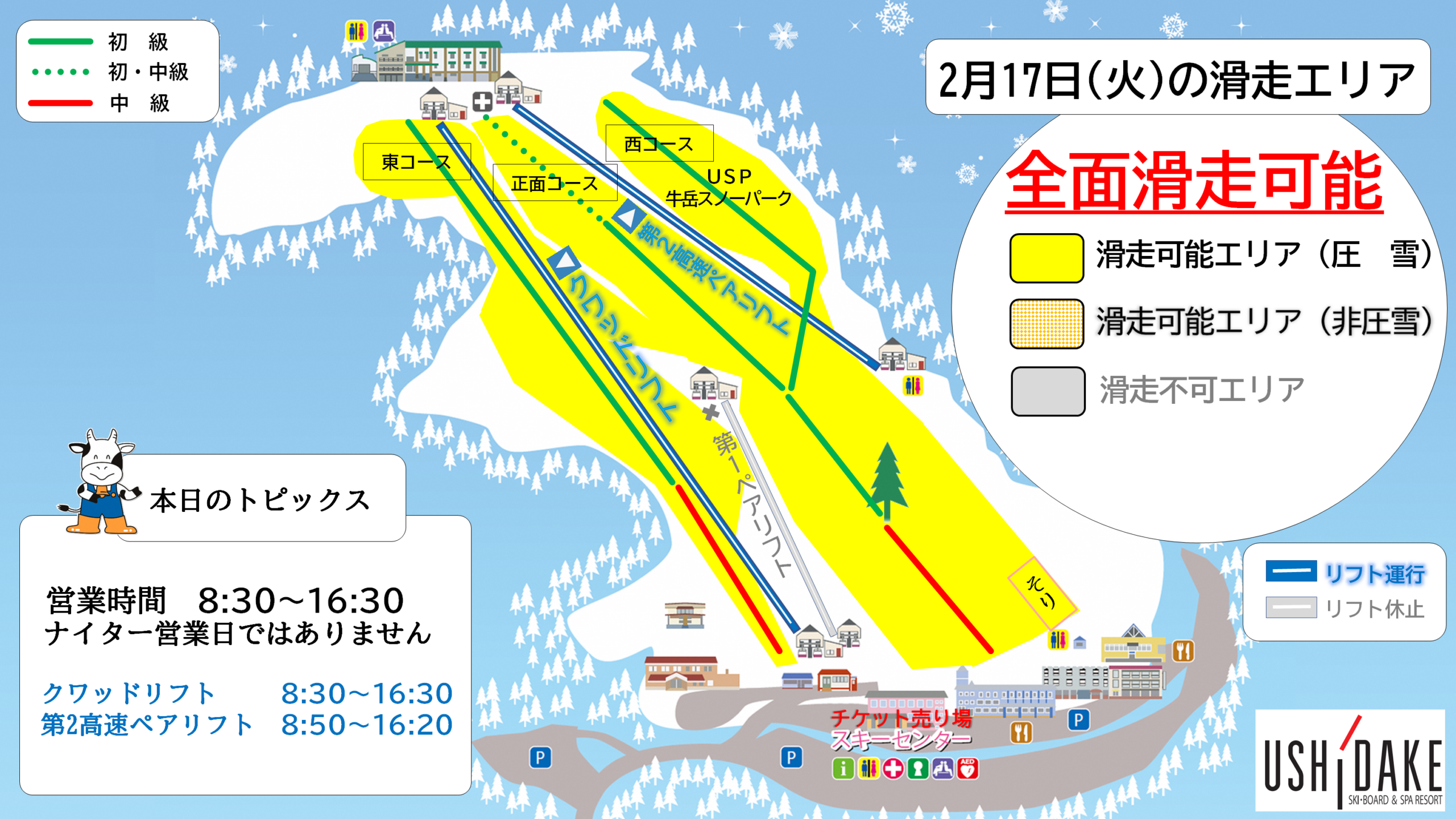 明日の2月17日(火)は全面滑走可能で、8:30~16:30まで営業します。