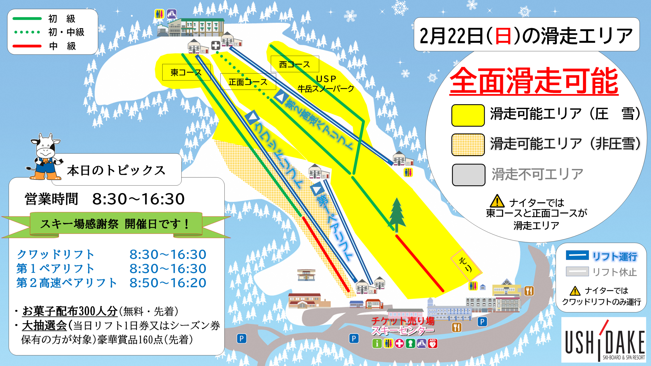 本日(2月22日)の営業情報について【スキー場感謝祭+全面滑走可能】