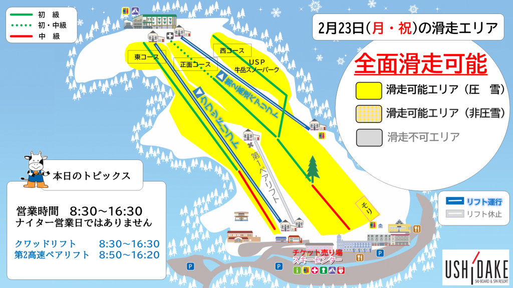 明日の2月23日(月・祝)は全面滑走可能で、8:30~16:30まで営業します。