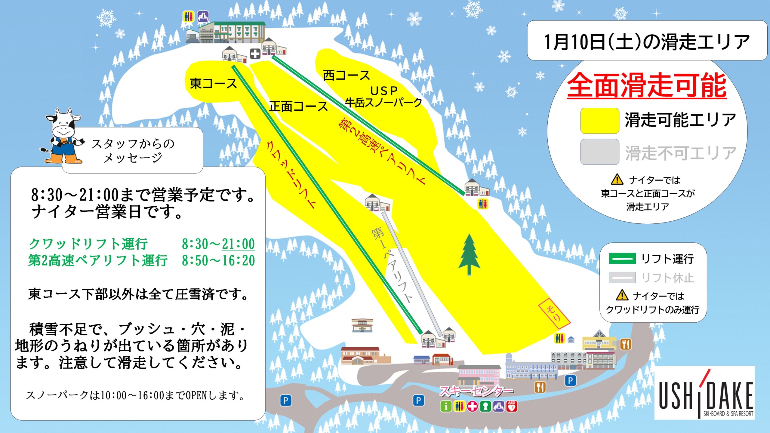 本日の1月10日(土)も全面滑走可能+ナイター営業日として、8:30~21:00まで営業します。東コース下部以外は全て圧雪済です。本日と明日は強風予報があり、リフトが減速運転や一時停止する場合がありますのでご了承ください。詳細はブログ記事をご覧ください。
