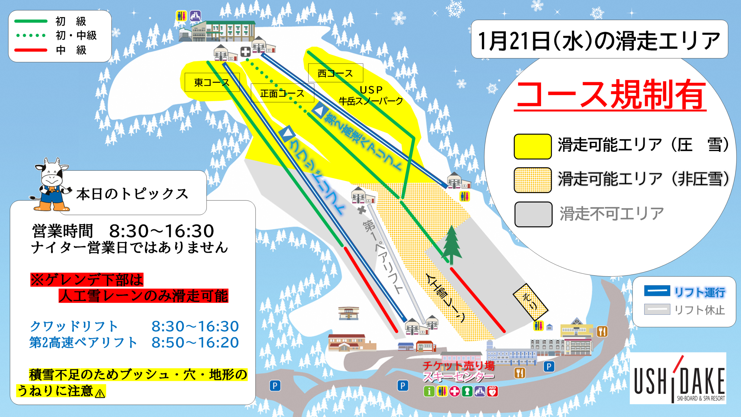 明日の1月21日(水)はコース規制有で、8:30~16:30まで営業します。積雪不足のためゲレンデ下部は人工雪レーンのみ滑走可能です。ゲレンデ上部は全面圧雪予定です。積雪量確保のためゲレンデ下部は全面非圧雪予定です。ゲレンデ全体的に積雪不足によりブッシュや穴、泥、地形のうねりが出ている箇所があります。 板の損傷や滑走技術に不安がある方はクワッドリフトに乗って降車することができますので、クワッドリフト降り場職員までその旨お申し付けください。予定している滑走可能コースの詳細等は下記ゲレンデマップや最新のブログ記事をご覧ください。