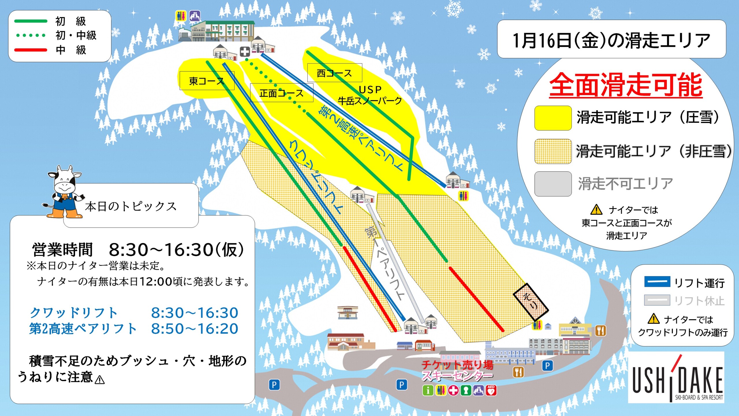 本日の1月16日(金)は全面滑走可能として、8:30~16:30(ナイターは未定)まで営業します。昨日からの雨で特にゲレンデ下部の融雪が進んでいるため、ナイター営業16:30~21:00の有無については午前中にゲレンデ状況を確認後、12:00頃にこちらのホームページで発表します。ゲレンデ上部は全て圧雪済です。ゲレンデ下部は積雪量確保のため非圧雪です。昨日から小中学校によるスキー学習が開始されました。2月上旬までの平日は、多くの子どもたちが練習に励む予定です。 年に一度の貴重な学習の機会となりますので、皆様には温かいご理解と、コース利用の譲り合いにご協力いただけますと幸いです。滑走可能コースの詳細等は下記ゲレンデマップや最新のブログ記事をご覧ください。