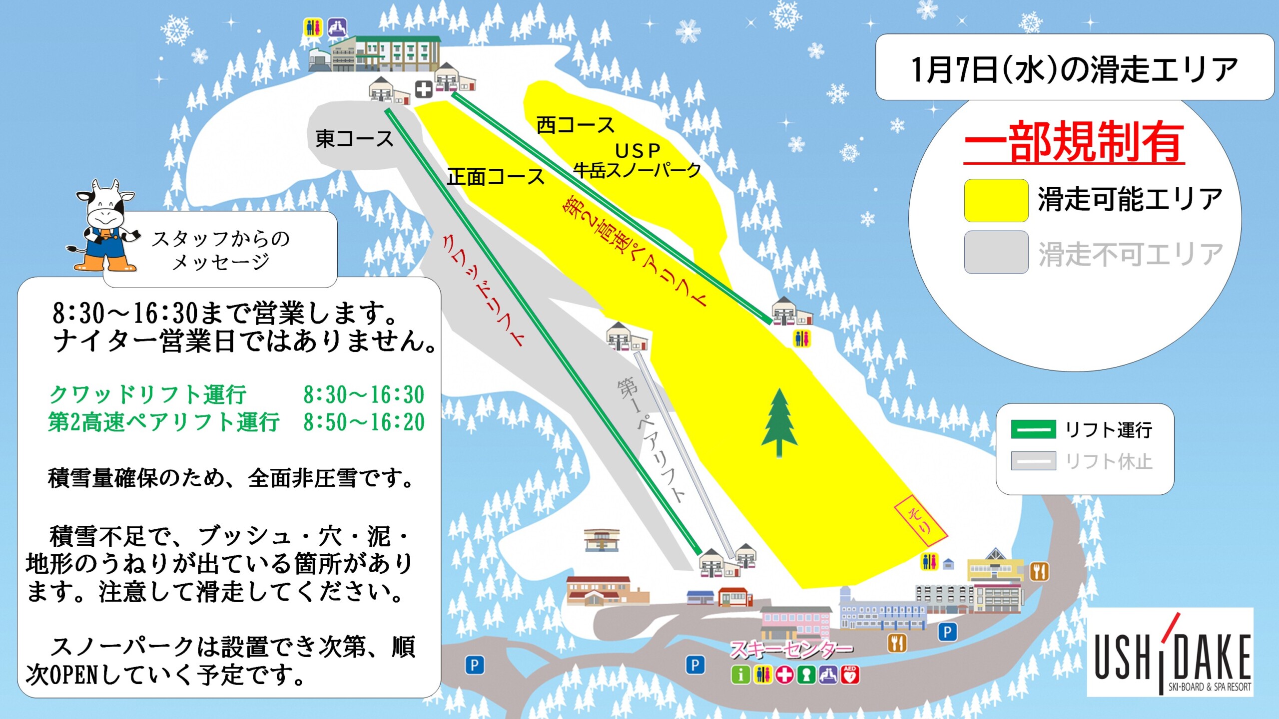 明日の1月7日(水)も正面コース+西コースのみ滑走可能で8:30~16:30まで営業します。ナイター営業日ではありません。 積雪量確保のため全面非圧雪の予定です。詳細はブログ記事をご覧ください。