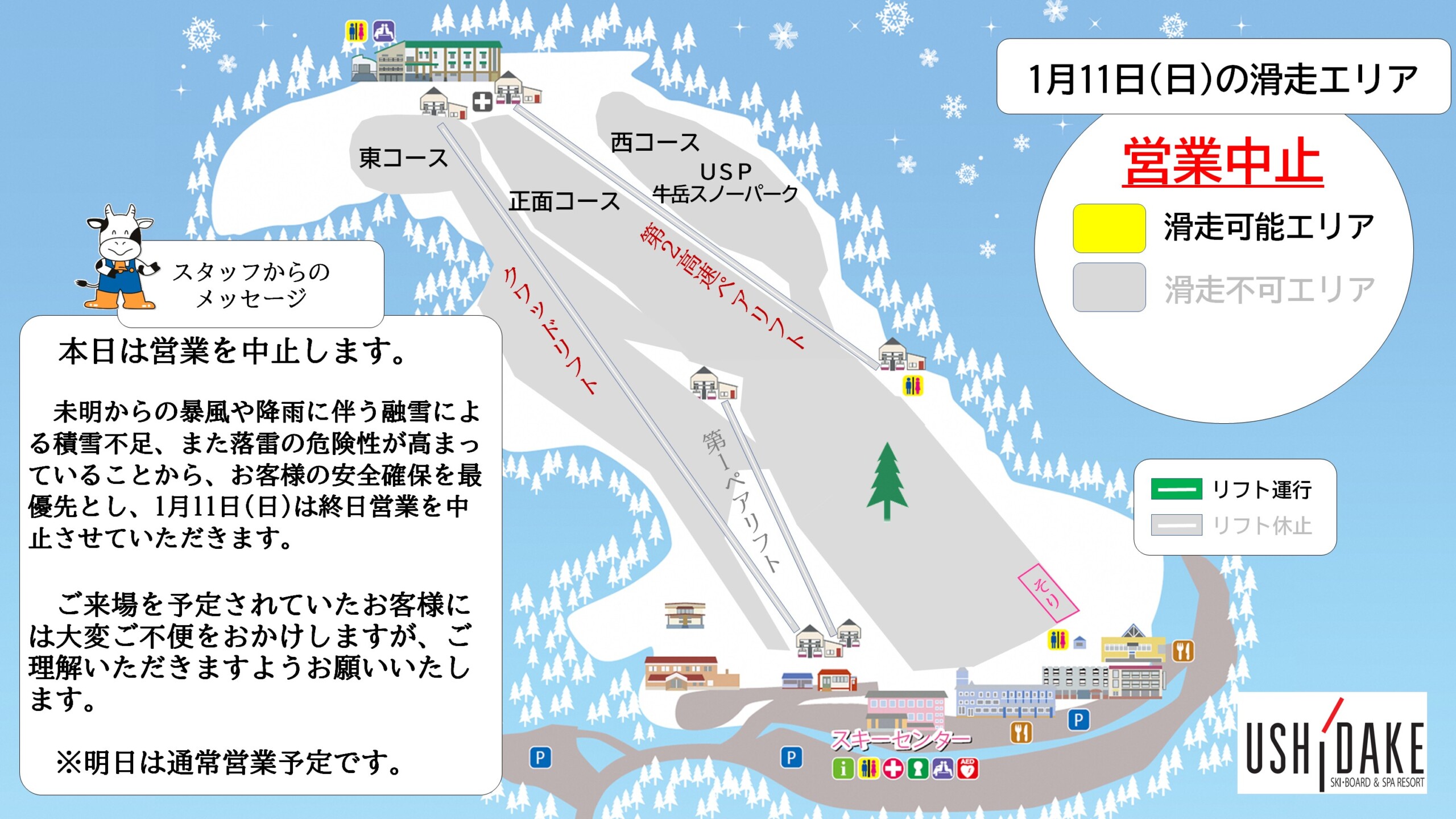 【重要】本日1月11日(日)はスキー場営業を中止します。未明からの暴風が1日続くことや降雨に伴う融雪による積雪不足、また落雷の危険性が高まっていることから、お客様の安全確保を最優先として1月11日(日)は終日営業を中止させていただくことしました。 ご来場を予定されていたお客様には大変ご不便をおかけいたしますが、何卒ご理解賜りますようお願い申し上げます。なお、明日は8:30~16:30まで営業予定です。明日の営業予定情報については本日中にお伝えいたしますので、ご確認ください。