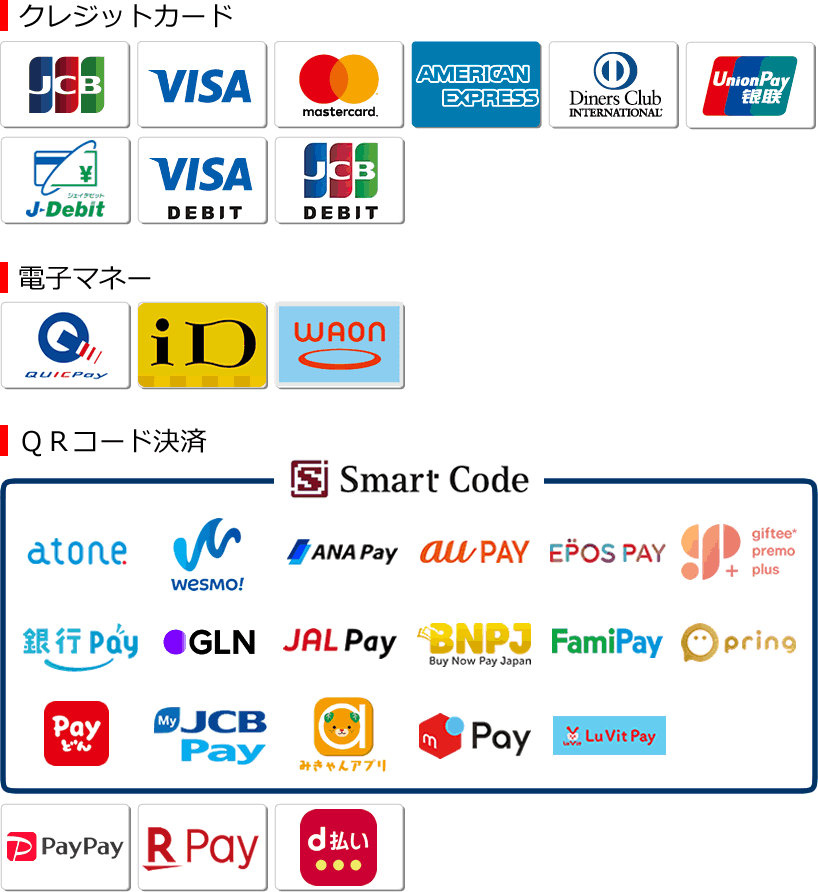 以下のキャッシュレス決済がご利用いただけます。
